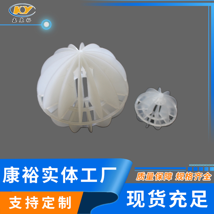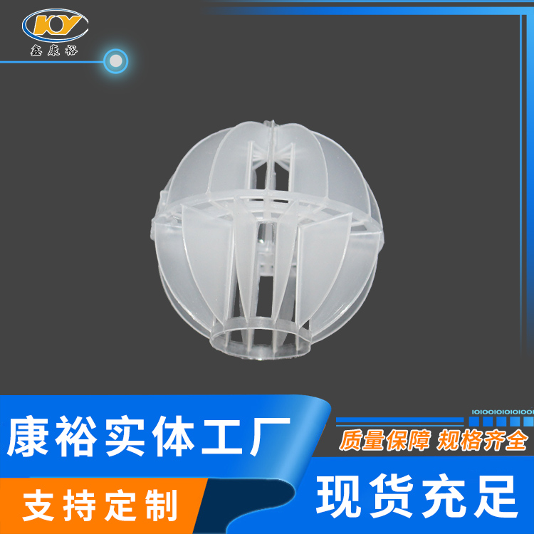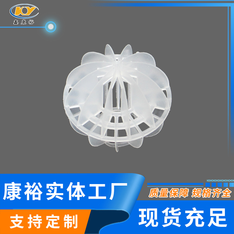 塑料多面空心球填料是水處理項目和廢氣處理常用到的一種填料,也是現(xiàn)在環(huán)保裝置項目常見的一種填料,大多采用聚丙烯(PP)塑料制成。多面空心球填料,在球中部沿整個周長有一道加固環(huán),環(huán)的上下各有十二片球瓣,上下球瓣互相交錯,沿中心軸呈放射形布置。多面空心球填料具有表面積大,傳質(zhì)效率高,產(chǎn)品的球瓣與球瓣之間空間大,且重量輕、強(qiáng)度大、安裝方便、葉片多,阻力小,耐高溫,耐腐蝕,性能穩(wěn)定,適用于中間水箱,二氧化碳脫氧塔,接觸反應(yīng)塔等裝置。在全國電力、化學(xué)、化纖、電子、造紙、化肥生產(chǎn)、河水淡化,環(huán)保、三廢處理等行業(yè)的水處理、脫碳、脫氣、凈化、脫碳酸及油水分離等處理裝置中廣泛使用。